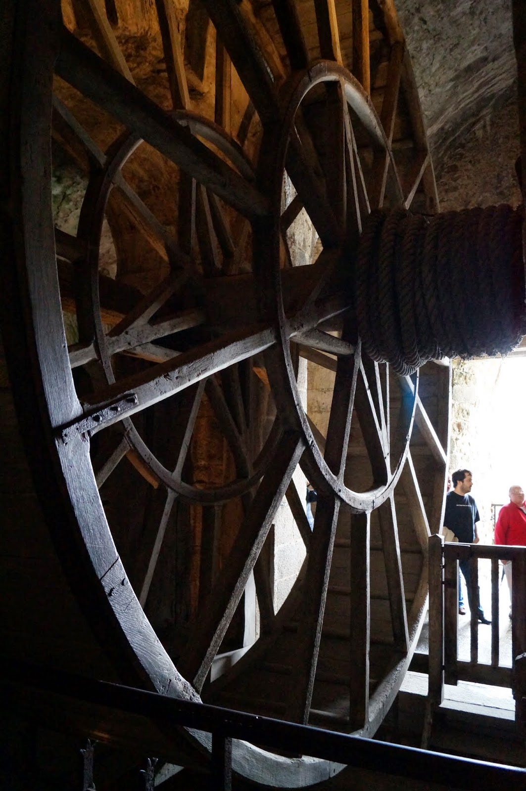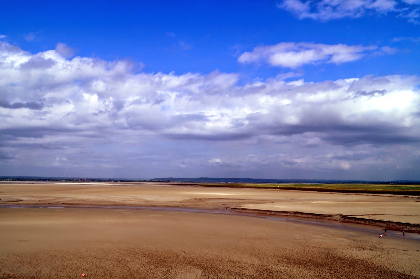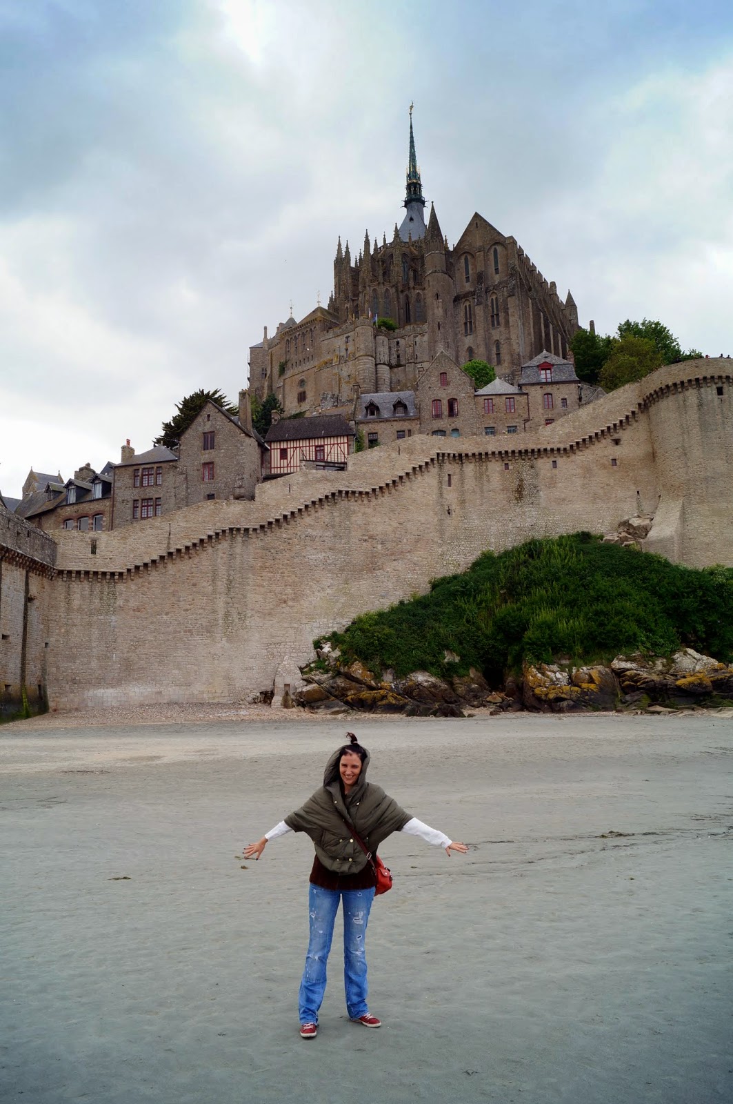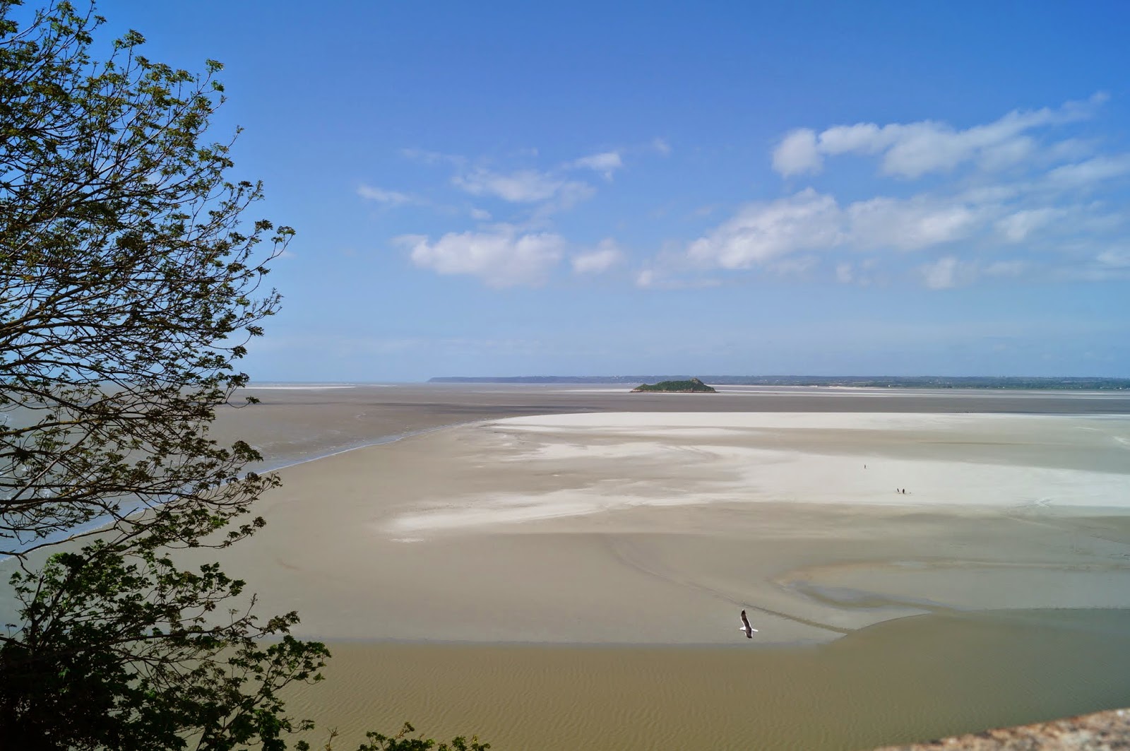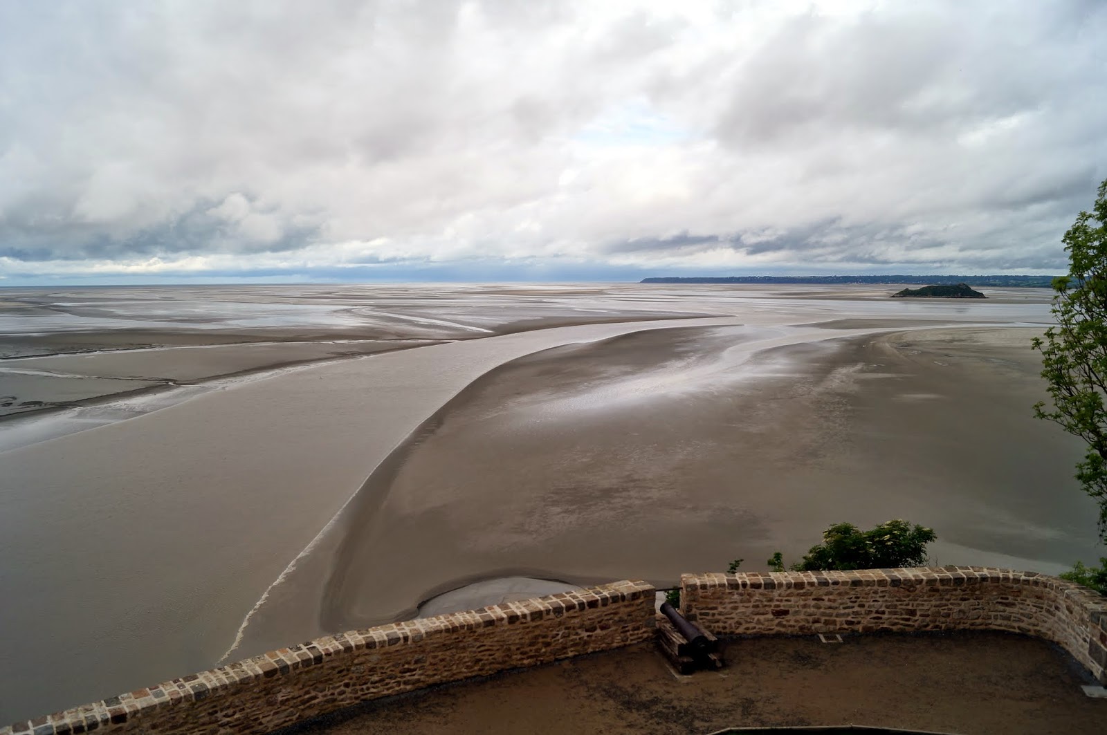 Вот такие мощные колонны держат на себе монастырскую церковь. А вот колесо для подъема грузов в монастырь - наследие тюрьмы, построено уже после закрытия аббатства, но в стиле средневековых колёс. А вот так выглядят контрфорсы , или по простому подпорки, держащие сооружение. Прогулки по крепостным стенам главное развлечение в крепости. Со стены есть доступ почти во все внутренние сооружения. Время обеда во Франции пропускать нельзя поэтому в 12 часов уже сидели в кафе Les Terrasses Poulard с видом на залив. Традиционная говядина на сковороде и в горшочке, а также местный сидр брют. После обеда перерыв в культурологических исследованиях. Пошли в супермаркет с местными продуктами. В отеле дают купон на 10% скидку, так что лучше купить все сразу за один раз. У нас так не получилось, посещали его регулярно. Eau-de-Vie, вода жизни, становится кальвадосом за несколько лет, если на этикетке написано: Fine, Trois etoiles, Trois Pommes - то кальвадос выдерживался в дубовой бочке минимум 2 года. V.O., Vieille Reserve, VSOP - кальвадос выдерживался в дубовой бочке минимум 4 года. Extra, XO, Napoleon, Hors d`Age, Inconnu - то кальвадос выдерживался в дубовой бочке минимум 6 лет. Еще один необычный местный напиток Pommeau de Normandie. С XVI века смешивают в особых пропорциях яблочный сок с кальвадосом и в 1970 он получил свое название Pommeau de Normandie, а с 1991 года даже свой АОС и теперь контролируется по наименованию. Крепость 16-18 %. Яблочный сок после ферментации превращается в Сидр. Сидр в Нормандии делится по видам, почти как вина Гранд-Крю - по цвету, букету, аромату, вкусу. Существуют три вида сидра - сладкий с содержанием алкоголя 2,5 градуса, полусухой и брют, с сильно выраженным яблочным вкусом и почти отсутствием сахара уже 5 градусов алкоголя. Тут и погода разгулялась. Солнце выглянуло, стало тепло. Решили собрать в дорогу рюкзачок и отправиться, прогуляться по зыбучим пескам вокруг скалы. С земли аббатство смотрится даже лучше, чем со стен. .