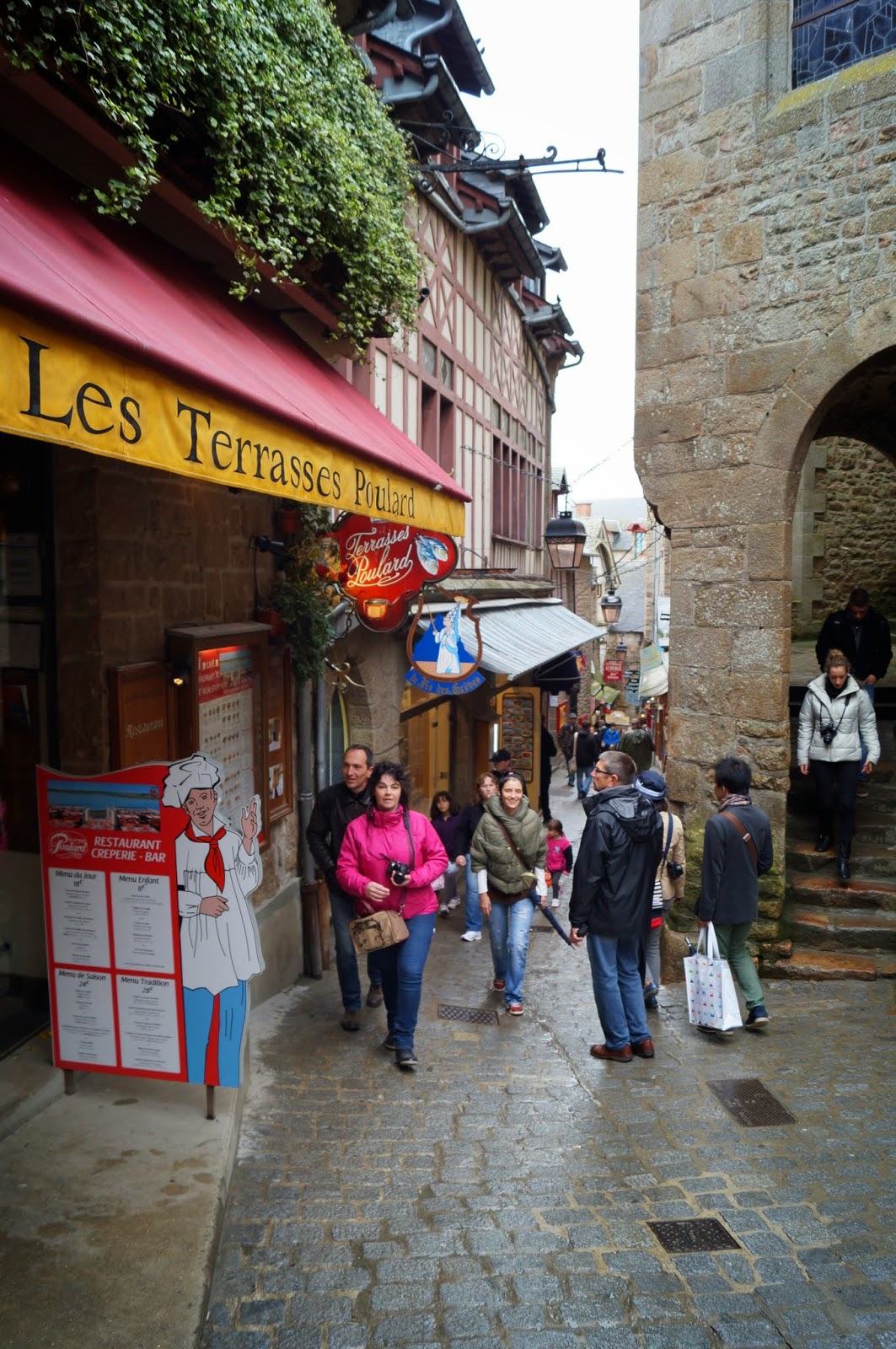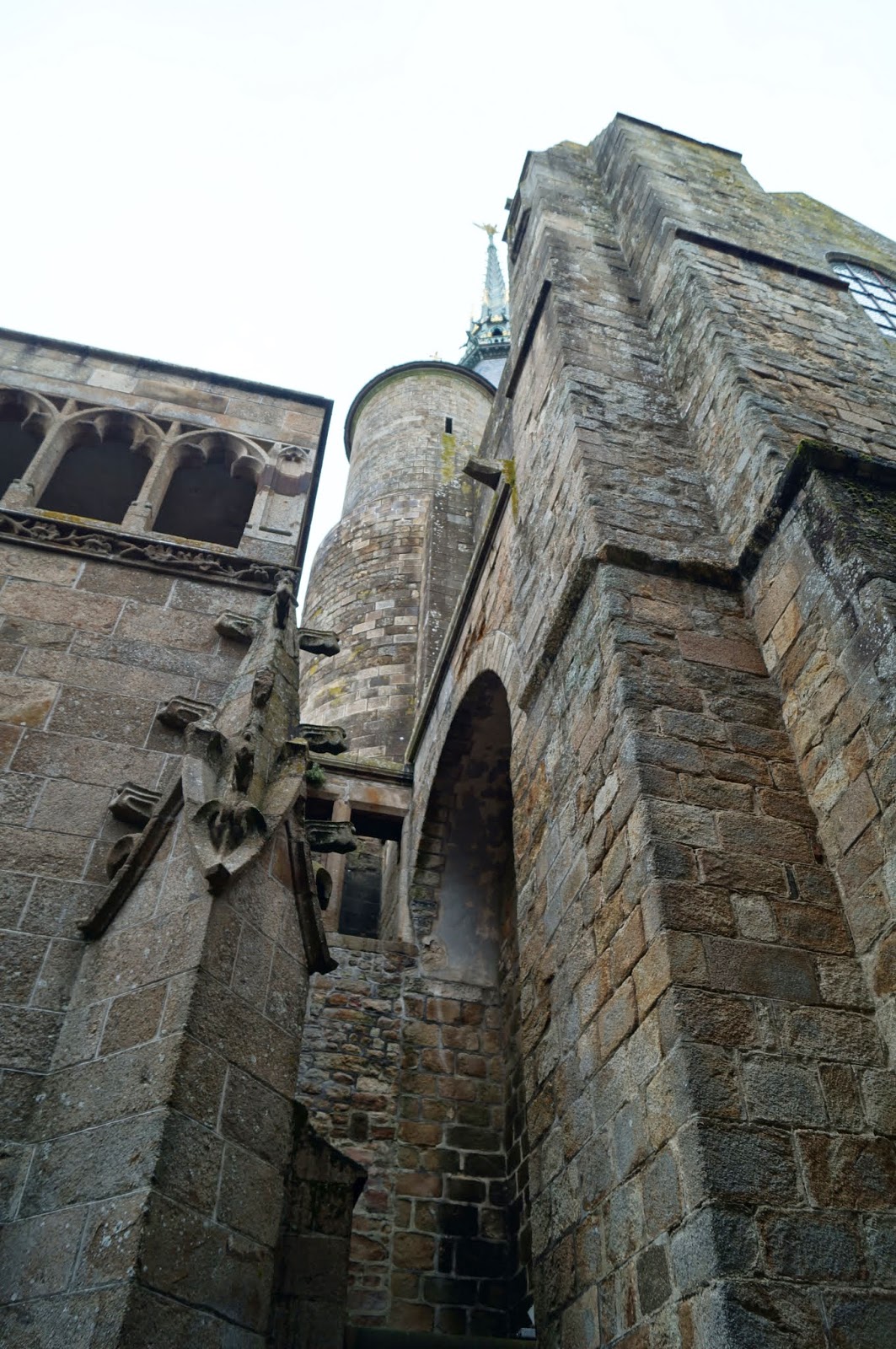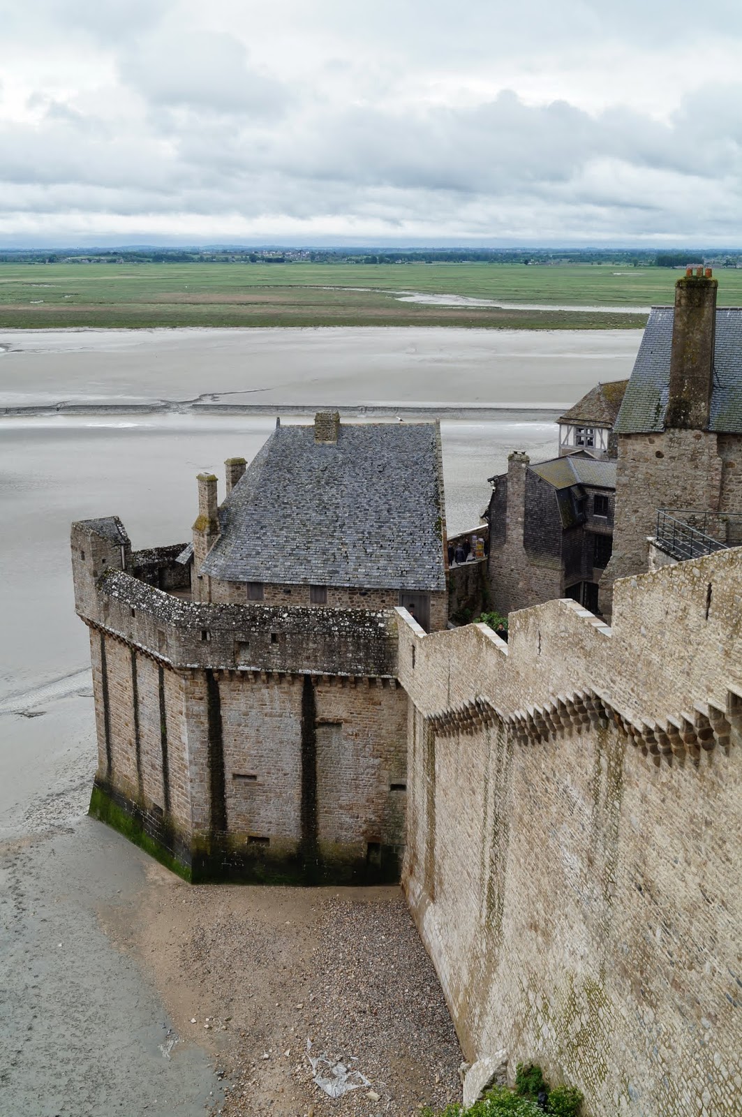 Ресторан Le Pre Salehttp://www.restaurantlepresale-montsaintmichel.com/en/home При отеле отличный ресторан, формульные меню позволяют выбрать ужин от 21 евро на человека, детское меню от 10 евро. Но мы решили начать с самого дорогого Menu Gourmet за 42 евро. По цене МакДональдса в Норвегии мы получили на старте 3-4 закуски на выбор, выбрали фуа-гра и « Milefeuille» тончайшее тесто с Andouille de Vire, сыром Camembert и ветчиной. В качестве основного блюда были для каждого свой вариант прожарки ягненка. Нужно отметить аутентичный местный колорит! «В зависимости от влияния моря на луг, где пасутся ягнята, мясо имеет каждый раз особое содержание соли и свой определенный аромат, который высоко ценится гурманами. На солончаках овцы питаются флорой, растущей на почве богато пропитанной солью и йодом прибрежных пастбищ залива Мон-Сен-Мишель». Вкус фантастический. Вот за этим я и еду во Францию. Потом были традиционная сырная тарелка с двумя видами сыра и конечно десерт. Про вино упоминать не буду, так как во Франции с этим все великолепно. Утром накрапывает дождик, но здесь такой сильный ветер ,что погода меняется каждый час. Так что дождик не пугает, собираемся и отправляемся в аббатство. Ветровка лучший друг туриста в Нормандии. Овечек за ночь стало побольше. Плотину открыли, вода на глазах начинает заполнять канал. В аббатстве пока немноголюдно. Вход в аббатство 9 евро. Сегодня забастовки не было. В 708 году здесь Архангел Михаил явился епископу Святому Авраншу Оберу (Aubert d'Avranches) и наказал построить на скале церковь. Церковь выстроили в лучших военных традициях и она выдержала множество осад, ни разу не будучи взятой. Мощные средневековые стены в основании церкви. Сразу веет суровостью монастырской жизни. С террас открывается вид на залив, море уже ушло. Внутренняя монастырская галерея. В трапезной масштабом поражают печи или камины , тут наверняка загружали целиком быка на вертеле не иначе.