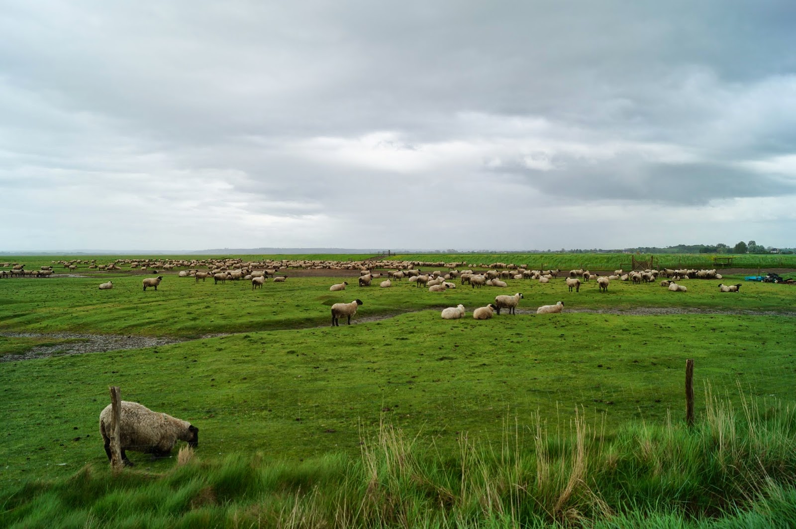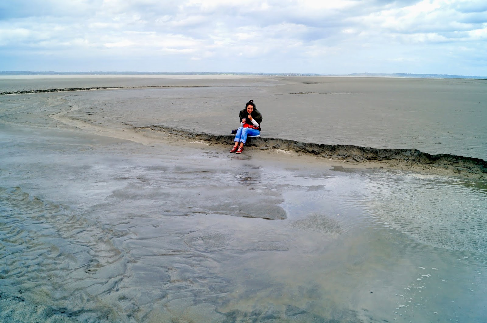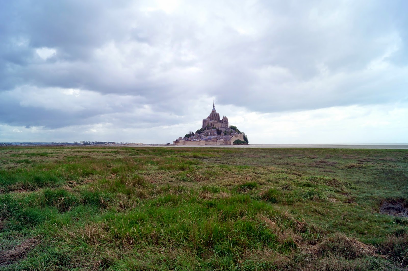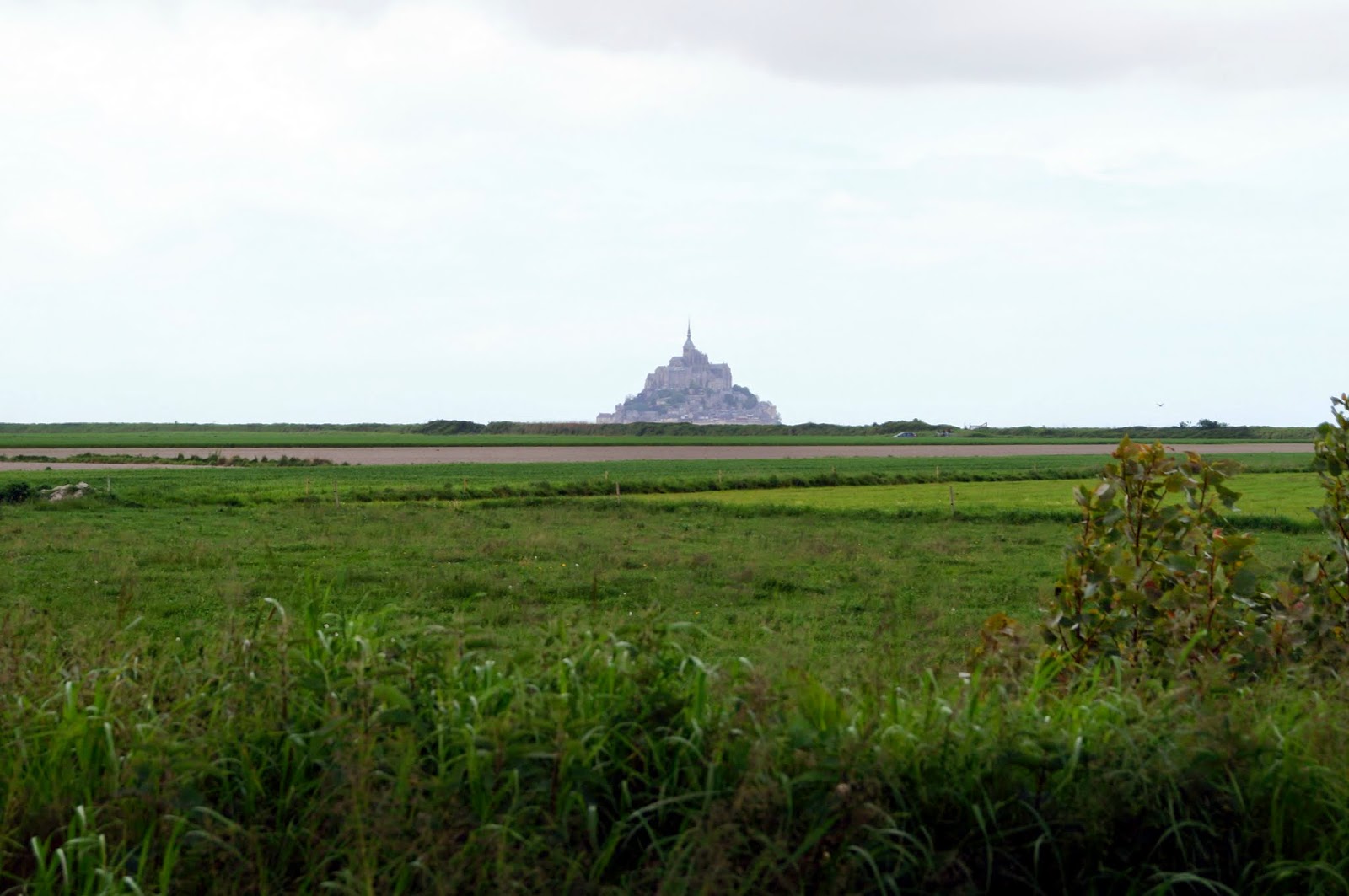 Когда пошли в путь воды не было совсем. Даже не разувались. Потом вода начала подступать не по часам, а по минутам, а может и по секундам даже. Теперь понятно почему вокруг аббатства не разрешают ходить без гидов. Можно очень быстро оказаться в воде. Да, при высоте приливов в 12 метров, можно представить, что происходит вокруг скалы. В общем постепенно отступаем все дальше , а вода все прибывает и прибывает. Почва из вязкого подобия глины. Потом, когда отчищали обувь и одежду было не просто. И сильный запах водорослей. Пора и рюкзачок распаковать. Скорость прилива достигает 6 км/час в самый сильные моменты. Сейчас она была конечно медленнее, но заливало все на глазах. Теперь только решить куда идти дальше, то ли ждать отлива, а когда он мы не помним, то ли пойти померить глубину. Часть групп ушли куда то вдоль кромки земли, может там выход есть, а может отлив все же будет скоро. Японские туристы отправились купаться, вернее отправилась только японка, а парень снимал супер ролик, может даже с эротическими элементами.. Так как в ее заплывах она погружалась по пояс вариант "перейти в брод" с повестки дня сняли. Да и погода опять поменялась - вместо солнца, набежали тучи и начал накрапывать дождик. Пришлось выходить на зеленую травку, правда насколько она обманчива мы не подозревали. Думали минут через 20 выйдем на асфальт. Аббатство удалялось, а местность становилась все более пересеченной. Каналы попадались все чаще и все глубже. Дождь лил все сильнее.